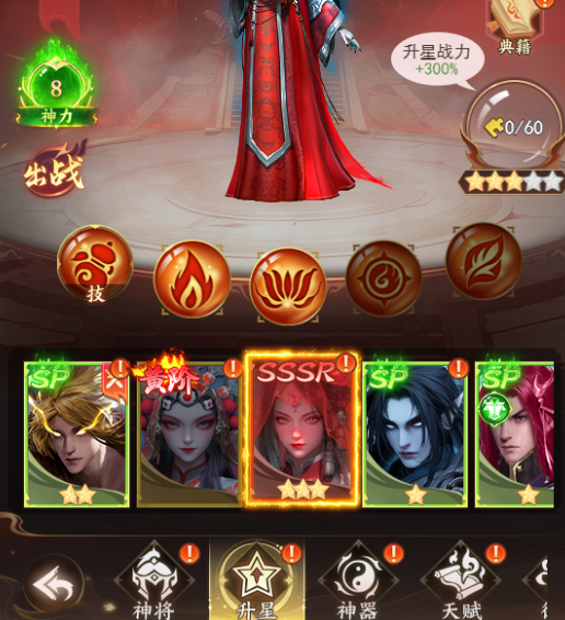升星机制 集齐指定数量的神将碎片即可升星。星级越高,所需碎片越多,但战力提升呈指数级增长,是中期核心成长路径。