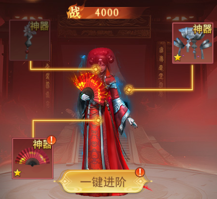 神器系统 每位神将可装备三件专属神器。重复获取同名神器可进行进阶,大幅提升属性。神器可通过召唤或限时活动获得。