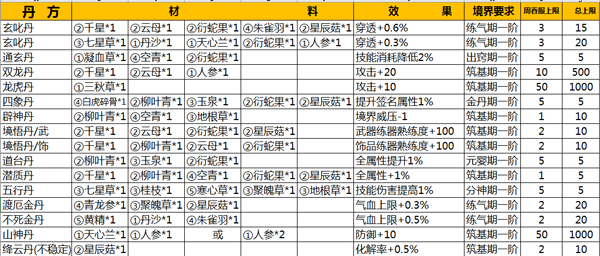 以下是完整丹方图鉴,助你精准炼制所需丹药: