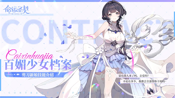 1、角色设定:以婚纱形象出现,是对契约者爱意强烈的结婚狂,内心如婚纱般纯洁,对爱充满幻想,但无法容忍任何不忠 ,婚纱与剪刀代表着她爱恨交织的情感。