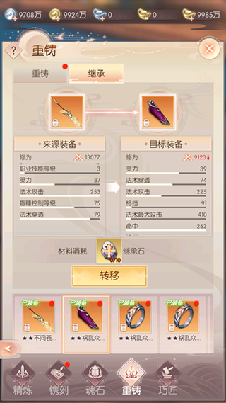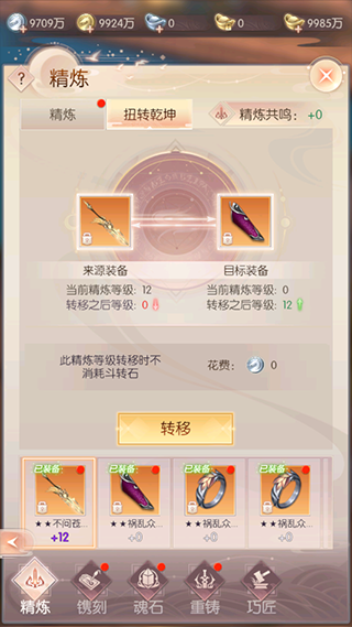 精炼转移可以把指定的来源装备的精炼等级转移到目标装备上。转移后,来源装备和目标