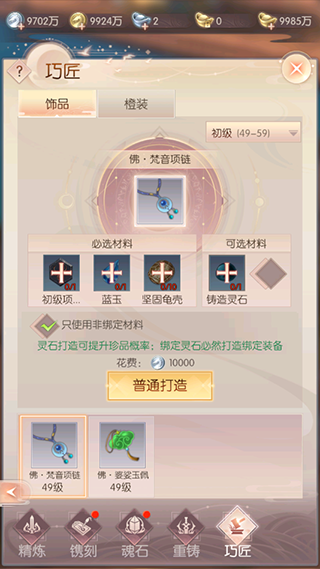打造饰品时,一定几率出现高品质装备,也有可能出现高等级装备。例如:打造49级项链时,一定几率可以打造出59级项链。