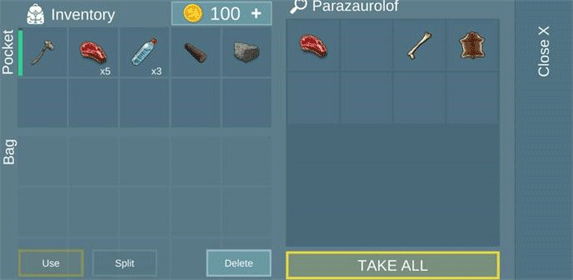 5、最后点击背包左边的按钮我们就可以看到自己所有的资源了,这些资源都可以帮我们很好的活下去;