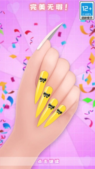 2、当界面出现 完美无瑕” 的结算提示时,表明当前美甲作品达标,此时点击 点击继续” 按钮,便可进入下一个美甲创作关卡。