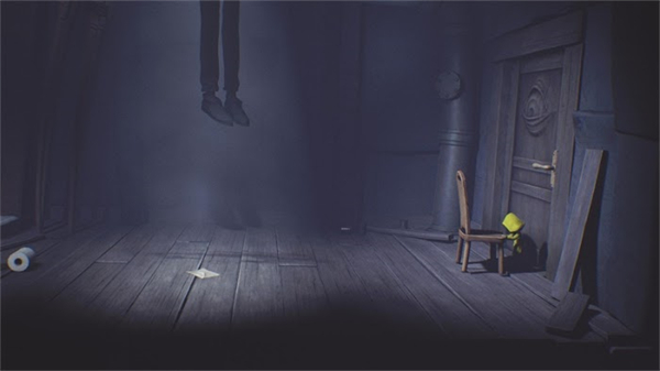 进入房间后会遭遇惊悚场景——一具悬挂的尸体。将椅子拖至门边,踩上后打开房门继续前进。