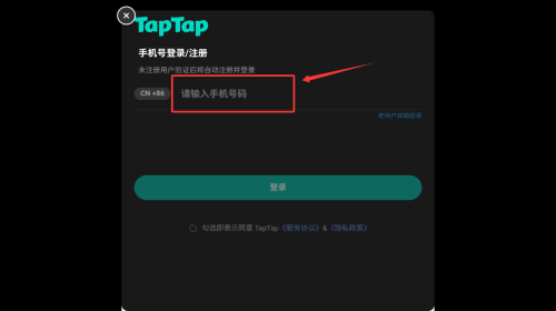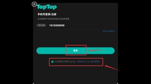 2、在TapTap界面输入手机号,点击红框登录按钮。