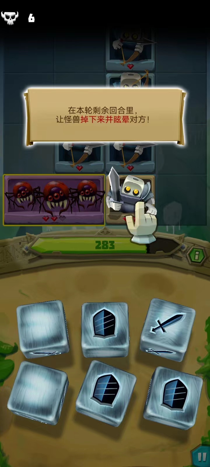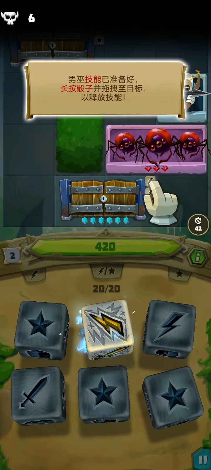 14、长按骰子拖拽至目标可以释放技能;而在回合结束的时候,所有的骰子都会充能一点,中间列中的骰子也由掷出的每个闪电图标和星星图标进行充能;