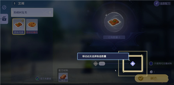 也就是所谓的基础回复类,映入眼帘的第一个便是原味肉排。点击之后就可以加入你当前所拥有的羊肉碎块,想要制造一个的话就需要花两个肉块才行。之后再选择你想要制作的数量,一般来说两个就可以了,一个可以要花费一枚银币,再点击右边的制造,静等一会儿就能开始烹饪了。