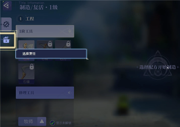 之后我们再跟营地对话,点击第一个打造。就可以进去了,第二个东西就是烹饪。烹饪又分成两种东西,第一种的话就是我们常见的药剂。药剂算是烹调,一般都用来恢复血量。但是我们的目的是制造美食,所以建议点击下一个选项。