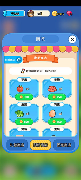 3、左下角是按钮是商店,点击按钮可以购买各种食材,主要用于烹饪食物,而烹饪秘方可以在关卡中触发不同剧情和角色获得。