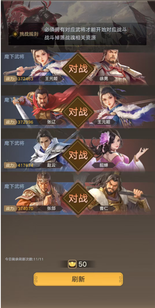武将单挑,主要是产出武将信物与魂玉、魂币,其中完成挑战且获胜即可获得对应的武将部分信物,该玩法中,仅能挑战已拥有的武将,可通过刷新来重置刷新可挑战的武将,每个武将挑战成功后会解锁下一阶段该武将的难度,难度提高同时奖励也会随之增加。