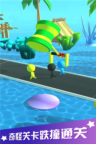 各种水上障碍等你来通关,还有大量模型的障碍,大锤子,大转盘,这些都是什么鬼啊,并且在奔跑的过程中,还有其他玩家会对你动手,过去就是一个左勾拳,非常的影响你的奔跑速度,可以和队友一起开黑,默契的配合。