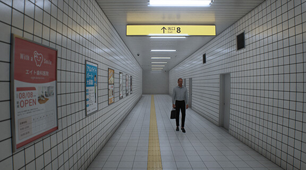 上方是排列整齐的白灯,有黄色的8号出口标识,标识后写着地下广场”。