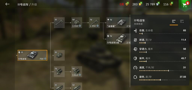 三号战车主要凭借自身的穿甲能力击败敌人,在前期的装甲当中,很难有敌方坦克可以与三号战车正面对决。也推荐玩家们尽早使用穿甲弹,这样可以让三号战车在战斗当中更具侵略性。配件的升级还可以改善自身的机动性,弥补三号战车的短板。
