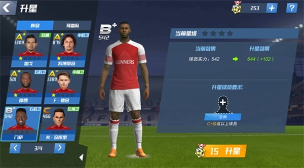 根据球员评级的不同,各球员都有自己的星级,S+(最高7星),S和S-(最高6星),A+、A、A-(最高5星),B+、B、B-(最高4星),其他球员(最高3星),所有球员初始星级都为1星,升星能提高球员能解锁球员技能和技能等级上限(技能系统后续推出),同时也能提高球员能力值。球员升星主要通过消耗冠军勋章还有相应要求的球员,一次升星最多消耗三名对应要求的球员。