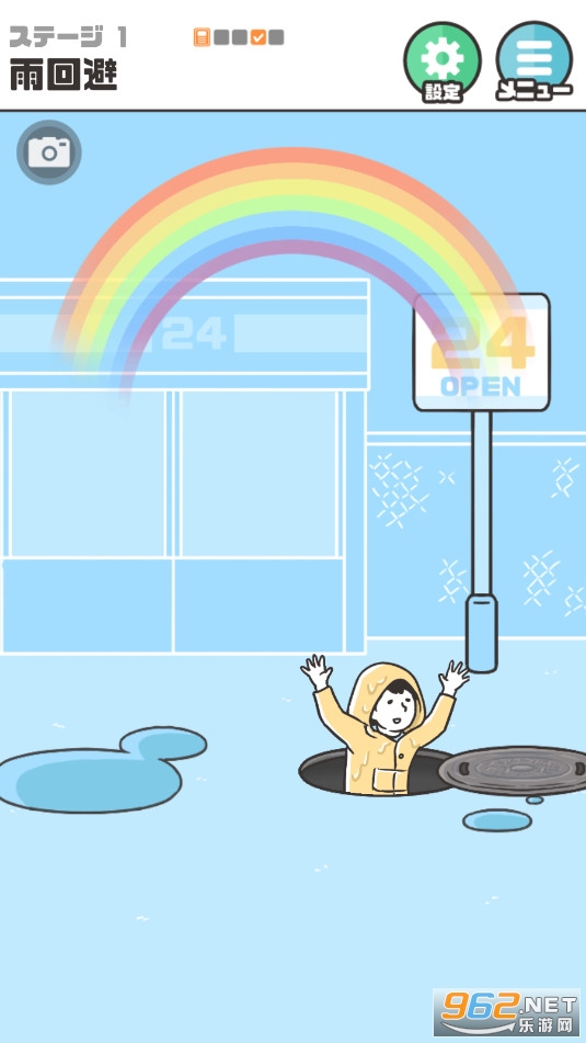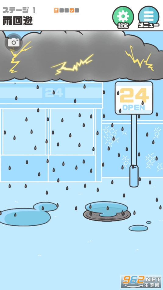 但穿雨衣还不够!天空即将劈下闪电,需迅速找到安全庇护所。注意地面的井盖——拖动角色钻入其中,即可完美躲避雷击。