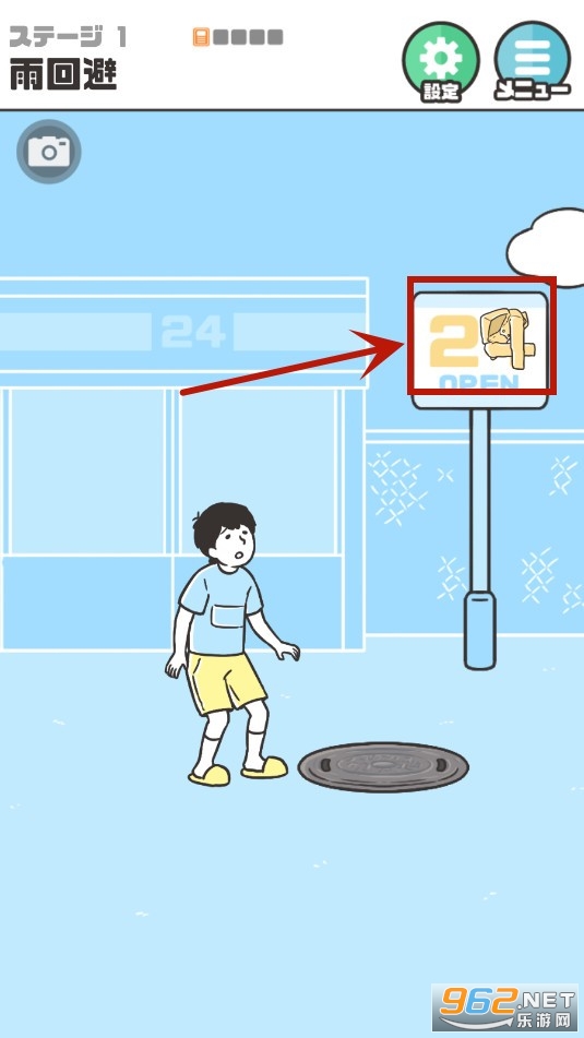 首关目标明确:安全避开雨水与雷击。仔细观察画面,你会发现路边广告牌上挂着一件雨衣——这是关键道具。点击获取并为主角穿上,即可免疫雨水伤害。