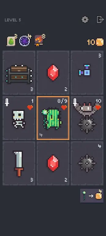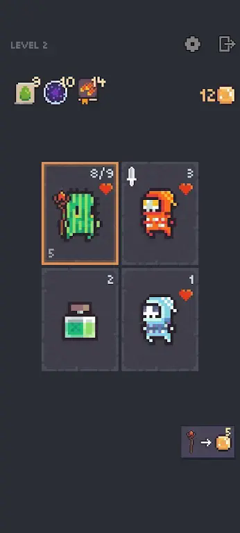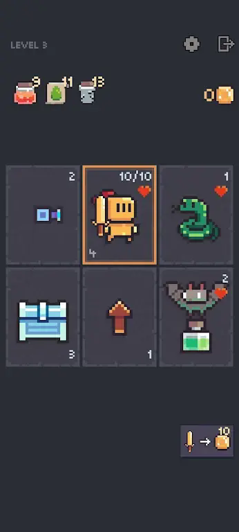 游戏采用直观的点击式操作:点击卡牌选择目标,再点击目标位置即可完成移动。但每次移动都会消耗回合数,因此合理规划路径至关重要。黄金散落在地牢各处,只有精准调度卡牌才能顺利收集。同时,英雄可通过使用药水恢复生命,善用卡牌间的联动效果,往往能以巧取胜,高效达成任务目标。