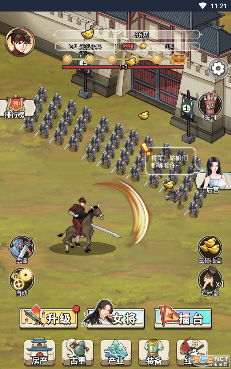 主角攻城、破城、砍小兵大将,拿下一个个城池、升级、获得美女的玩法,男人最喜欢的:战斗+美人!开局我还骑着一头驴,在城墙下打小兵,这游戏还有个后宫!好家伙,还不给进,在这吊我胃口,要打赢曹操才能开启后宫,但你看我这头驴,再看看对面,失败!