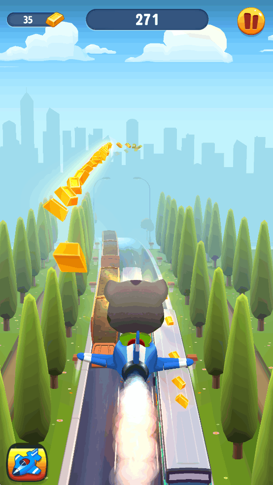 “梯云纵”是武当派的轻功绝学,能够让人直接飞跃到半空,不仅可以瞬间脱离战斗,更能获得喘息之机。在《汤姆猫跑酷》中,同样存在与此招效果相仿的道具——“飞机”。玩家拾取该道具后,可以驾驶飞机在完全没有障碍物的空中尽情收集金条,在紧张刺激的跑酷过程中,驾驶飞机无疑是一段难得的清闲时光;而跳伞降落后,玩家在短时间内也不会遇到障碍物。值得一提的是,飞机与前文提及的头盔、磁铁、双倍金条相同,都可以通过金柜开出的强化道具进行升级,提高道具持续时间。