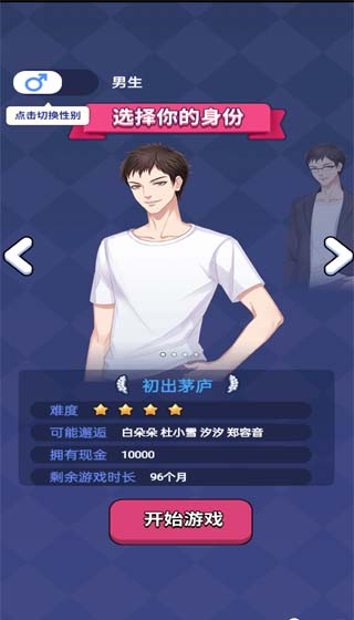 进入游戏就有四种身份可以选择,成功人士、海归精英、学富五车、初出茅庐。不同开局的难度和游戏时长不同,遇到的人和事也会有所区别,对于刚入手的新手玩家来说,小编建议你先从最低难度的成功人士”来熟悉游戏的操作流程。
