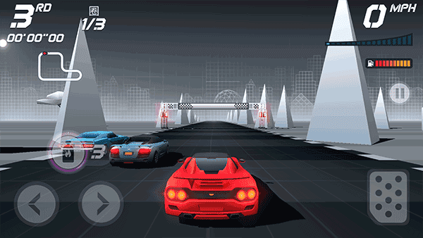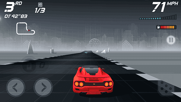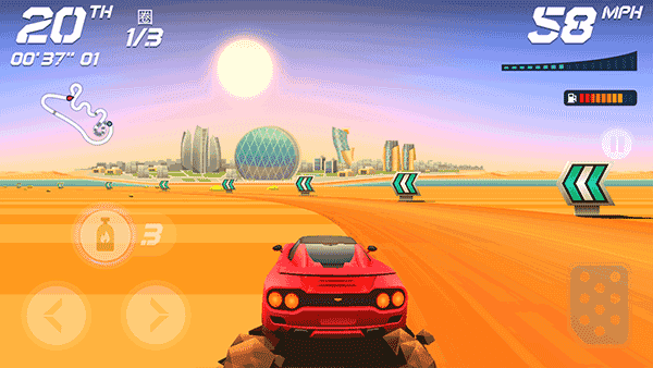 游戏操作简洁直观:点击左右按钮控制方向,按住右下角踏板加速,松开即减速。比赛目标是在燃料耗尽前率先冲线,途中需收集蓝色金币用于购车、升级,并合理使用氮气实现关键超车。注意——频繁碰撞会加速燃料消耗,务必谨慎驾驶!