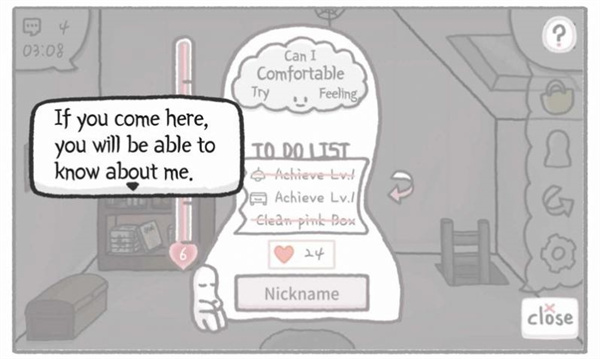 2、这个游戏是为了更多的了解郁抑症的朋友,在游戏里每五分钟就能得到一次谈话机会,你可以和他增加熟悉测量度,当你们更亲密时,有些事情就会改变。