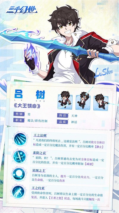 逆我者亡,这是不可违背的法则”。吕树对敌方全体目标施加一定百分比的魔法伤害,并有一定概率使其陷入静止状态。