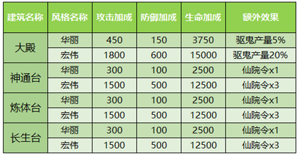 建筑一共有3个风格,除了告示栏外都是永久生效(告示栏风格使用为7天)。华丽风格使用仙院令兑换获取,宏伟风格通过VIP等级礼包获取。
