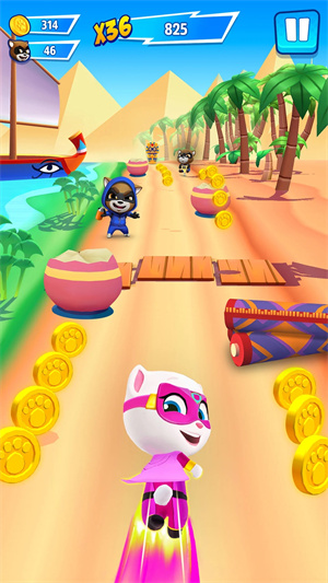 汤姆猫英雄跑酷破解版采用了经典的跑酷模式,游戏的一大特色就是操作十分简单易上手,简单的上下左右滑动就可以为玩家带来一整天的休闲娱乐。游戏场景丰富多样,包括城市、丛林、沙漠等,每个场景都有独特的障碍物和挑战。同时,游戏还提供了多种道具和装备,如火箭鞋、护盾等,帮助玩家获得更多的分数和奖励。