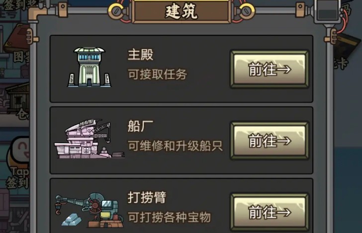 主殿是每日活跃的核心,务必优先完成每日及周常任务——其中秘境打怪”实为进入大秘宝危险区作战,别错过奖励。船厂负责船只维修(当前版本暂未开放升级功能),而打捞臂支持最长6小时挂机,记得及时领取收益。加工厂将鱼肉转化为主要资源,作坊则用于制作鱼竿(具耐久)与一次性消耗的鱼叉。酒馆是英雄招募地,每12小时可免费抽一次,强烈建议开局观看广告获取黄金,并尽可能进行十连抽以快速组建强力阵容。