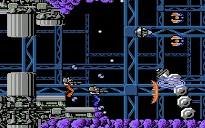 别看是第1关BOSS,难度并不低,下面四个舱门有两种功能,一是发射金属球,二是放出炮台,如果炮台一直存在,则停止发射金属球。金属球被打爆后直接消失,不打爆则会自爆变成两颗子弹,主角离它们远一些,不难躲避子弹,毕竟子弹飞行速度很慢。右侧BOSS核心部位周期性发射蓝色光柱。这是一场持久战,主角需要在场景下方耐心打破下面四个舱门放出的炮台、金属球。找机会上去打BOSS核心部位,主要以消灭下面的炮台、金属球为主,尤其是金属球,要在它们出现前下来站位攻击,如果它们已经出现了,主角再下来就会受伤。
