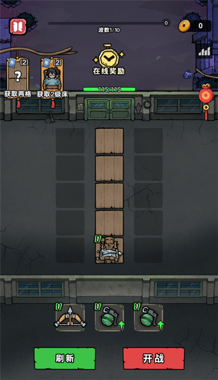 3、接着点击下方战斗,点击开始游戏,玩家需通过刷新来获取防御塔,两个相同的防御塔可以合成更高等级的防御塔;