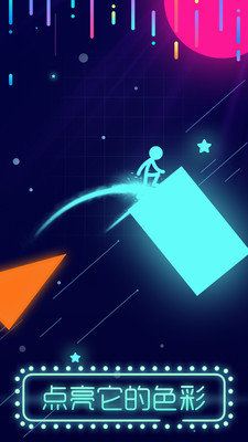 是一款画面简单关于跳跃的闯关冒险小游戏,游戏以火柴人为主角。在漆黑的夜空中,散发出耀眼光芒的火柴人,需要勇敢不断地翻转跳跃,将移动的霓虹灯色彩点亮,照耀黑色的星空。越到后面游戏的难度会越高,火柴人如果停止跳跃,整个霓虹灯的色彩都会熄灭,世界又会陷入到一阵黑暗中。