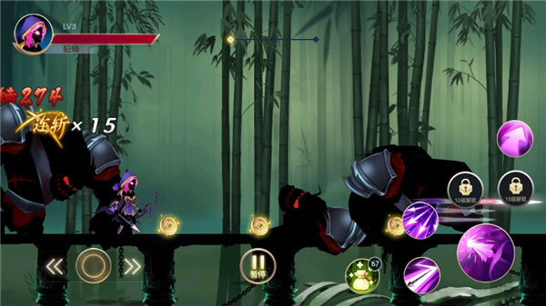 2、进入游戏界面,点击右侧攻击按钮可以攻击前方敌人,长按攻击可以连招对敌人造成更多伤害;