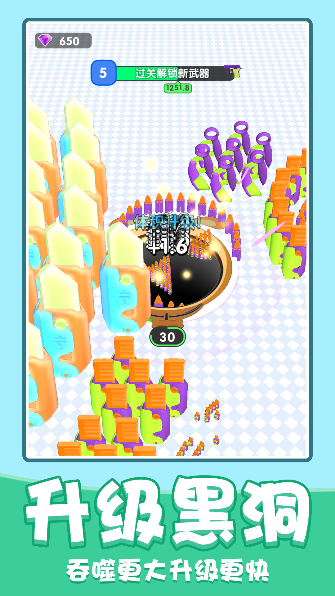 1、提供多种道具,利用这些道具来增强黑洞的能力,提高游戏得分。