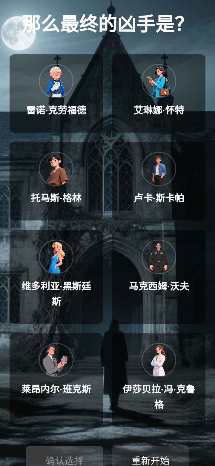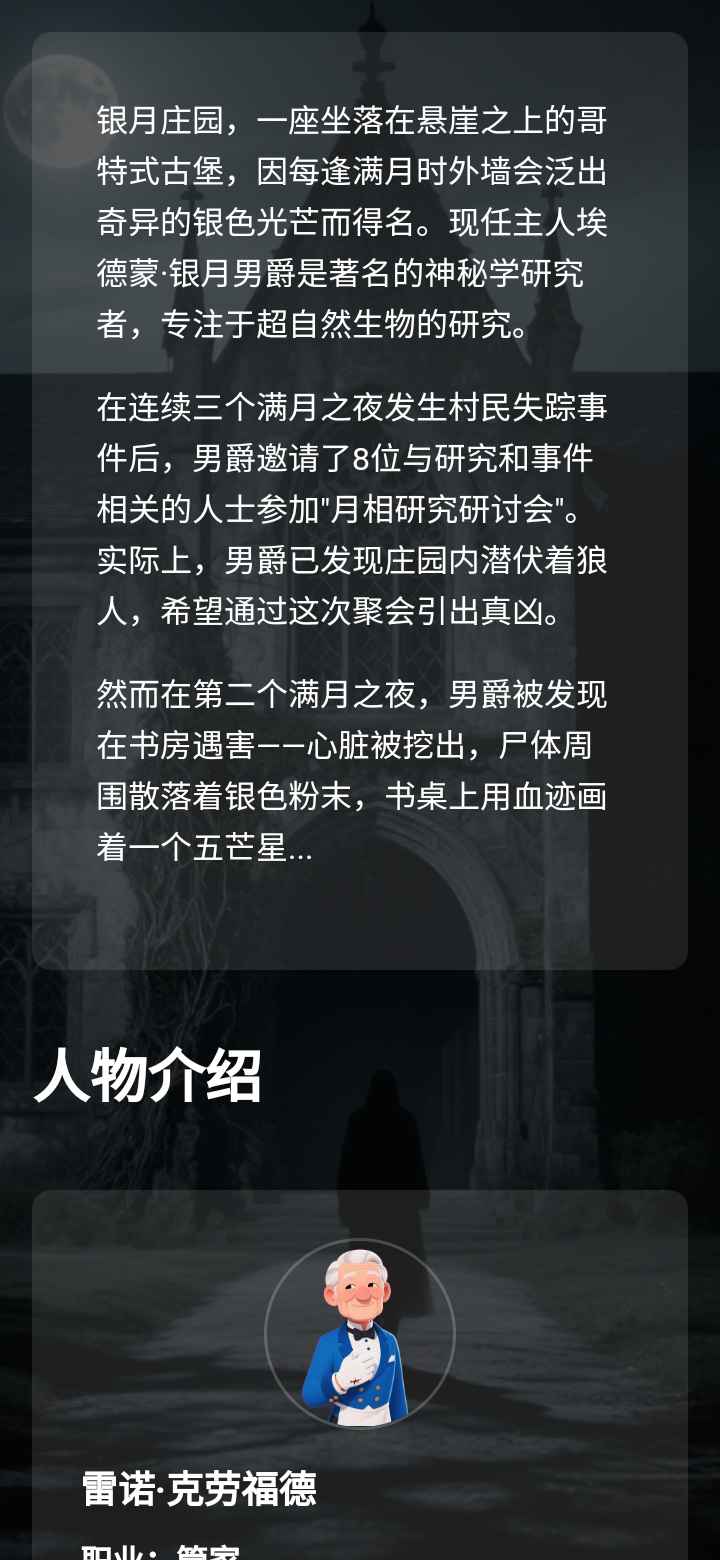 游戏背景设定在阴森诡秘的银月庄园:每逢满月,悬崖古堡便泛起银色异光,接连三晚村民离奇失踪。神秘学研究者埃德蒙男爵以月相研讨会”为名,邀请8位身份各异的宾客齐聚庄园——实则布下天罗地网,意图诱捕真凶。玩家将扮演其中一位受邀者,通过对话、搜证揭开线索:古董商的狼首怀表、灵媒的塔罗牌、生物学家的基因笔记……每件物品都暗藏玄机。当圆月高悬,黑夜审判”开启,狼人现形猎杀,幸存者必须在黎明前指认真凶。多重支线剧情与随机身份系统,确保每一局都是全新挑战——谎言与真相,只在一念之间。