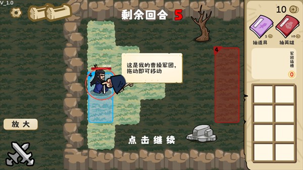 3、每回合开始时,角色左上角数字即为可用行动点数;右上角可抽取强力道具与三国英雄,下方物品栏则存放已获得的辅助资源;