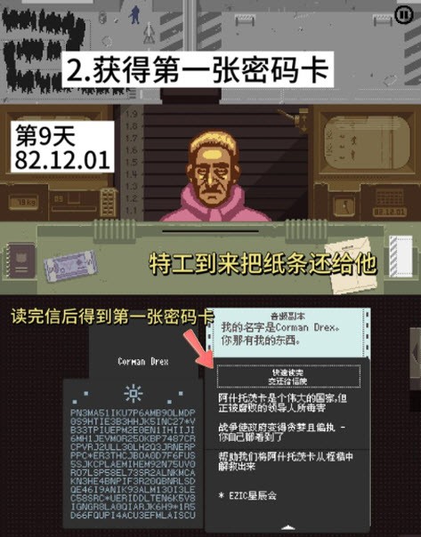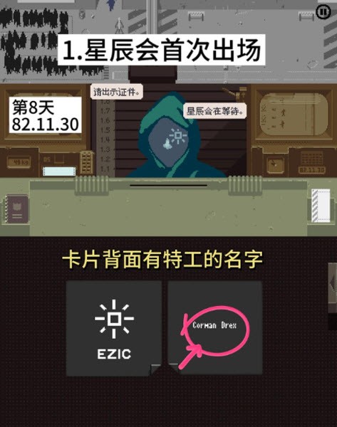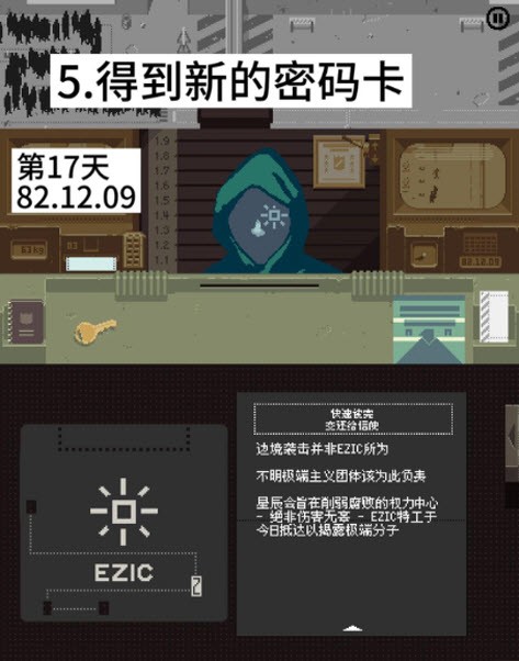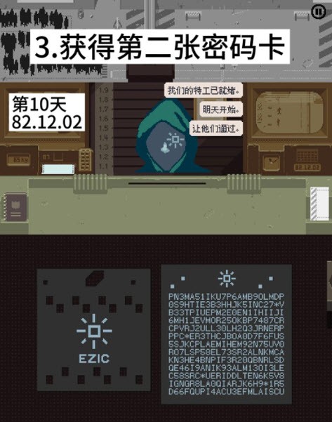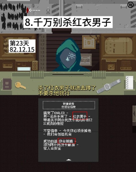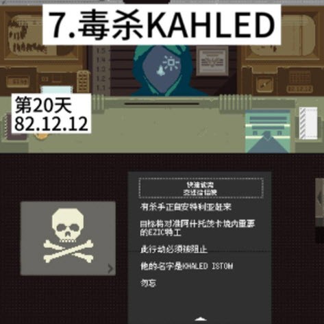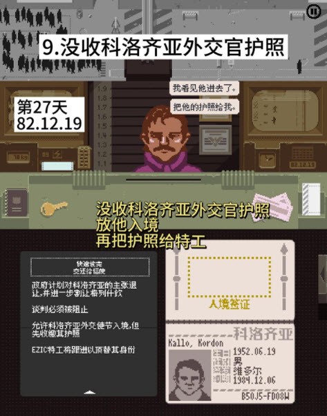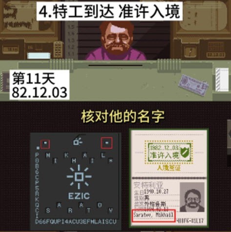 第8天:将卡片交给姓名以 C 或 D 开头的入境者,获得第一张密码卡。第10天:接收第二张解密卡;第11天放行第6位 MIK;第14天放行第9位 STE(⚠️切勿收取组织大额现金,否则会被邻居举报并没收全部存款!)。第15天:收取两张密码卡;第17天将解密卡交给当天第9位姓名以 E 开头的人,并得知红衣男子无需击杀”。第20天:将毒药洒在第9位 KHAL 的护照上,完成毒杀任务。第23天:务必不要击杀红衣男子!第27天:没收第7位入境者的护照,以便后续组织特工顺利入境。第31天:面对炸墙袭击,保持冷静——不要开枪、不要行动,静待事件结束即可达成第19个隐藏结局!