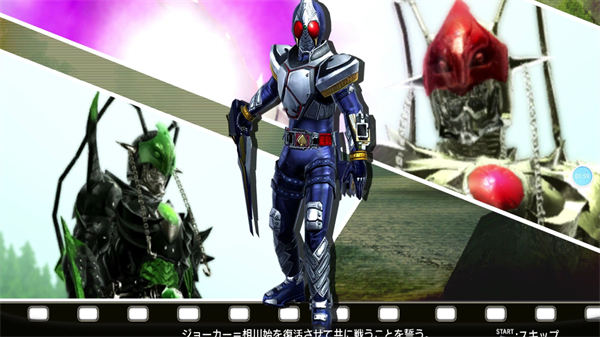 游戏画面整体表现力尚可,战斗过程还是非常流畅的。下面是开场的一段视频内容,从视频也可以看出以假面骑士无双来判定的话同屏人物也比较令人满意。开场只能使用铠武,要到第三关才能更换角色。
