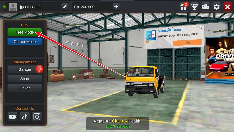 2. 进入主界面后,点击Free Mode”(自由模式)开始无压力驾驶体验。