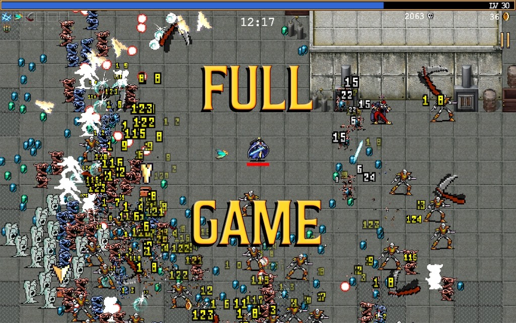 《吸血鬼幸存者》的画面风格简单直接,采用复古像素风呈现。虽然角色动作略显单调,类似90年代早期游戏的表现方式,但死亡动画还算有趣。整体美术风格虽然朴素,但在敌我混战、特效纷飞时仍具有良好的辨识度,便于玩家判断战场局势。