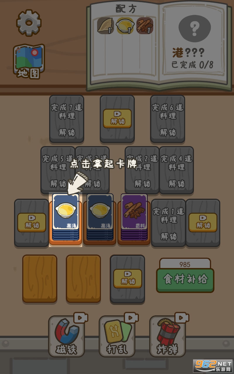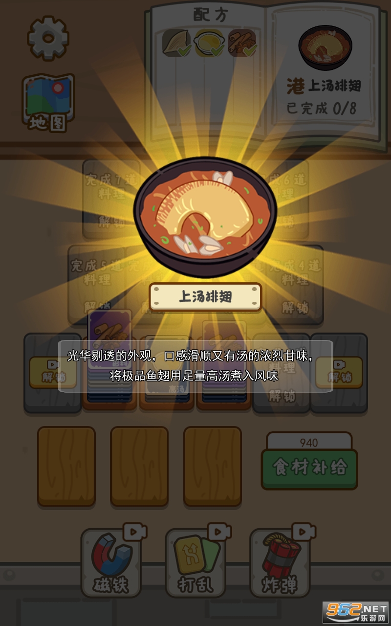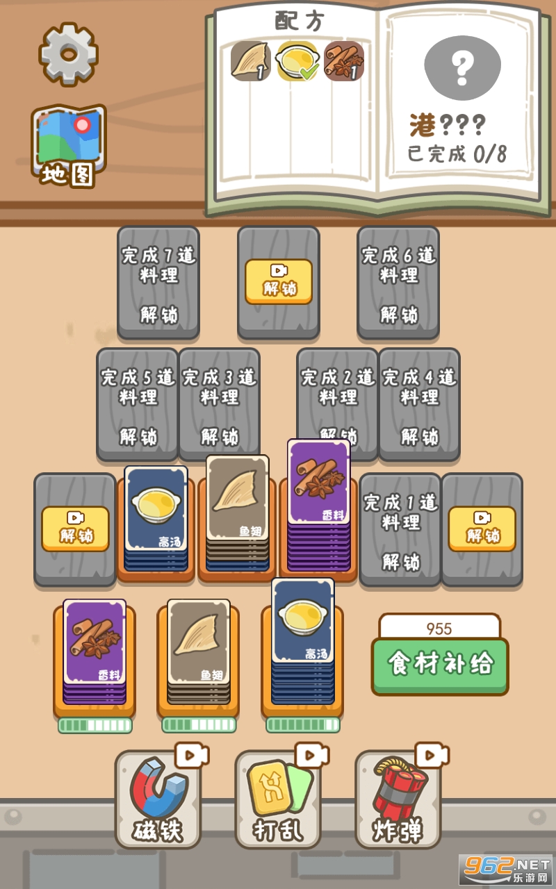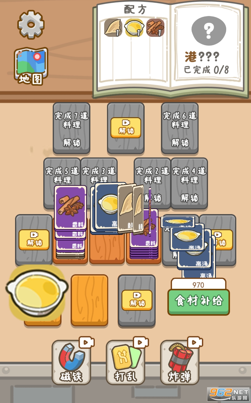 厨神驾到是一款休闲合成小游戏,你需要先收集每道菜的配方,然后再解锁全国特色菜,把地图点亮!