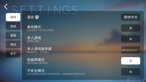 5、在【设置】选项中,可以进行细致的个性化设置,包括语言、音符以及画质调整,还能体验多人游戏模式。