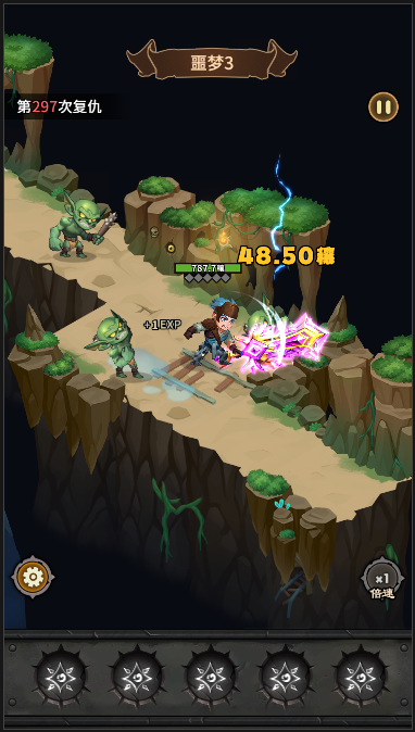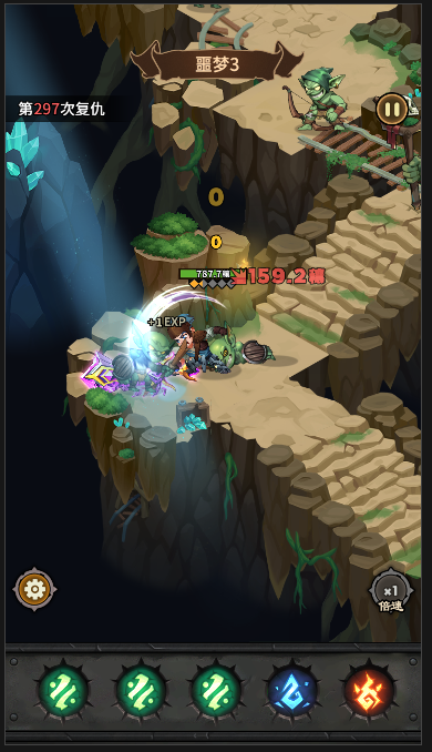 2)三消。屏幕下方会随着时间生成三种符文,点击消除符文角色便会释放对应技能;绿色对应回血符文,蓝色对应防御符文,红色对应攻击符文;当有相同符文紧挨着时,点击会一次消除多个相同符文且产生更强的效果;