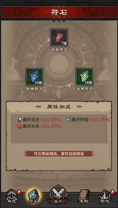 3)符石系统。升级符石会提升玩家点击符文产生的技能效果。