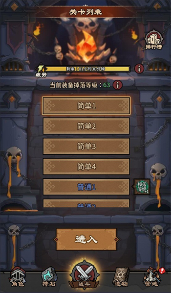 3、选择关卡难度进行挑战,获得资源。