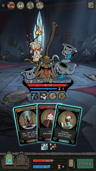 每个怪物都用灵魂打击击杀,配合药剂买血,基本稳稳的200+血量,看到装备栏+1必选,看到炽热斗篷/捕兽夹/古怪符文就拿,基本第二章boss开始,所有小怪和boss都能一张牌不出看着他死(某不出牌的长枪除外,当然,能继续灵魂打击弄死的当然要打击啦,加血多香)。