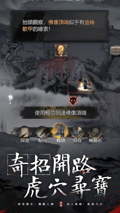皇城天降暴雨,行人当街融化朝廷任命你为司天监,率领36路奇人查案而这只是探索的开始,各地诡案接连发生一个暗黑、悬疑、猎奇的世界正在你脚下露出端倪从不画眼睛的纸人,满村的人体傀儡……猎奇诡事,不断遭遇无头佛像脚下的地底祭坛,半夜才出现的鬼市,每张地图都危机四伏易容骗取路线,轻功绕过王,数十种探索手段,自由探索禁忌之地金丝软甲,刚玉披风,寻宝数百种神兵,你离它们仅一步之遥36种奇门职业,力士,隐卫,幻术师……战斗同样刺激走入黑暗,真相大白司天监大人,请开始探索。