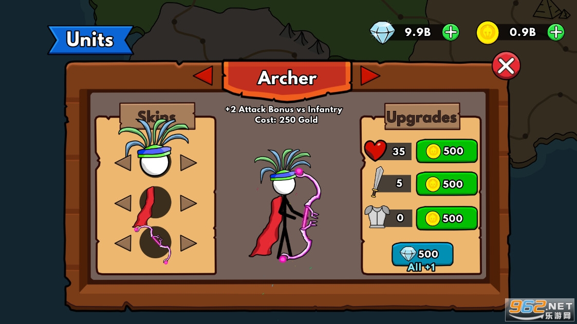 释放您的创造力,并根据需要自定义您的火柴人单位。单独选择皮肤,从一堆皮肤中进行无限组合;头盔,斗篷和盔甲,剑,弓,长矛和盾牌,斧头,枪支,投石索。